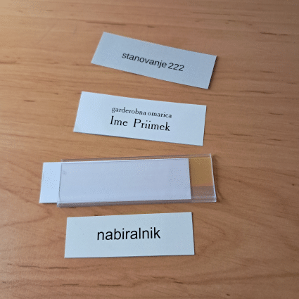 Manjši plastičen žepek, enostavno vstavljanje in menjavanje napisov. Primeren za označevanje garderobnih omaric, omar, arhivov, predalnikov, nabiralnikov in podobno.